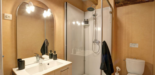 Douche, lavabo, WC, sèche-serviettes, sèche-cheveux.